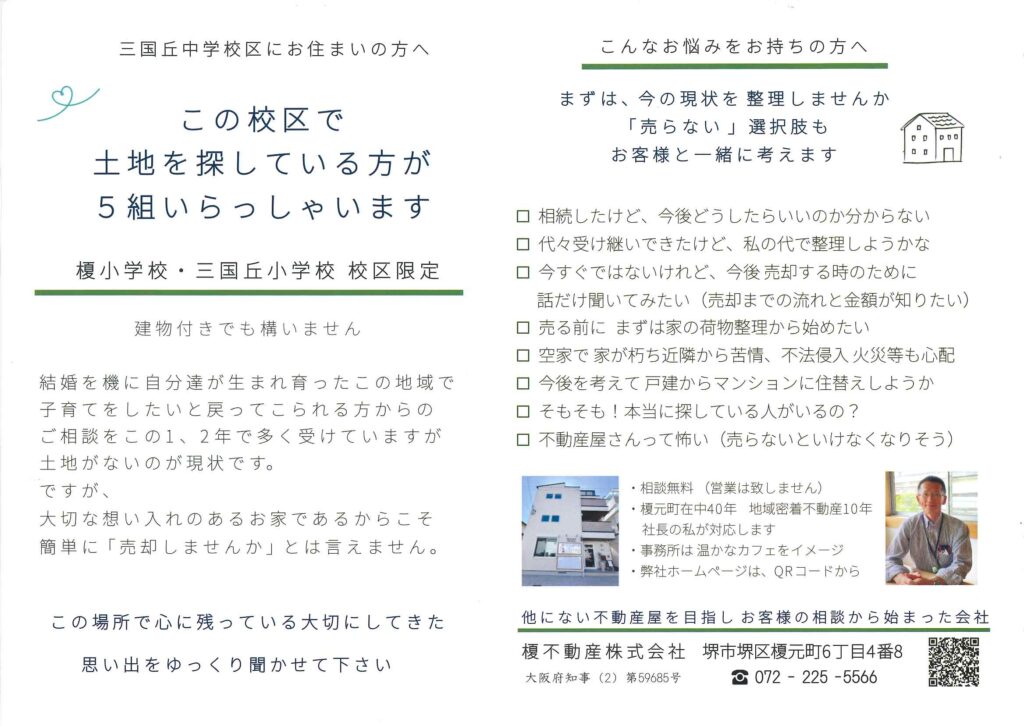 今、三国丘中学校校区で建替え用の土地を探されている方が